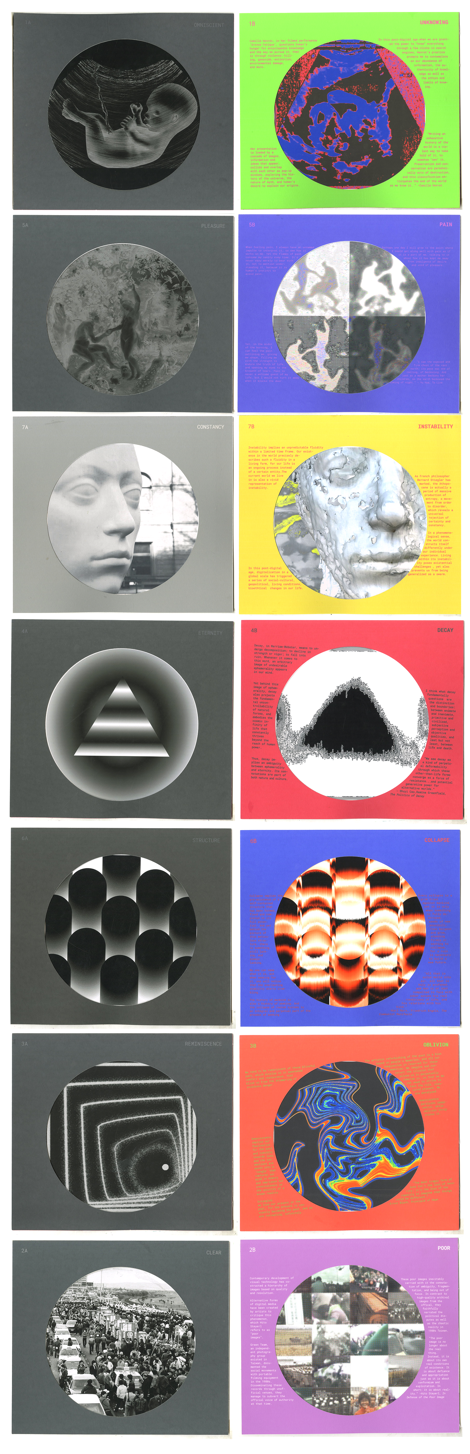 As shown from the studies, although the act of preserving reflects human’s effort to prevent things from changing, decaying, dying, sometimes it projects the opposite consequences, sometimes there is a voice requesting the alternative, and sometimes the act of preserving and not preserving resides simultaneously. I realized that the act of not-preserving is just as significant as preserving, and this fact is often overlooked or simply negated. Therefore, I dive into the idea of not-preserving involving seven related concepts that are normally considered as negative, undesirable and pessimistic. I displayed the dichotomy between these concepts and their ‘positive’ sides, interpreted them with my intake from the studies I did with reference from literature, film, media theory or solely from my own life experience, and executed them into a set of visual representations aiming to free them from those dichotomy that covered their true form. They are my defense for the act of not-preserving.
